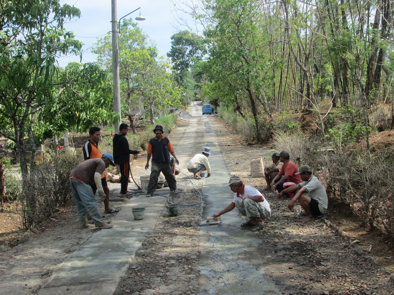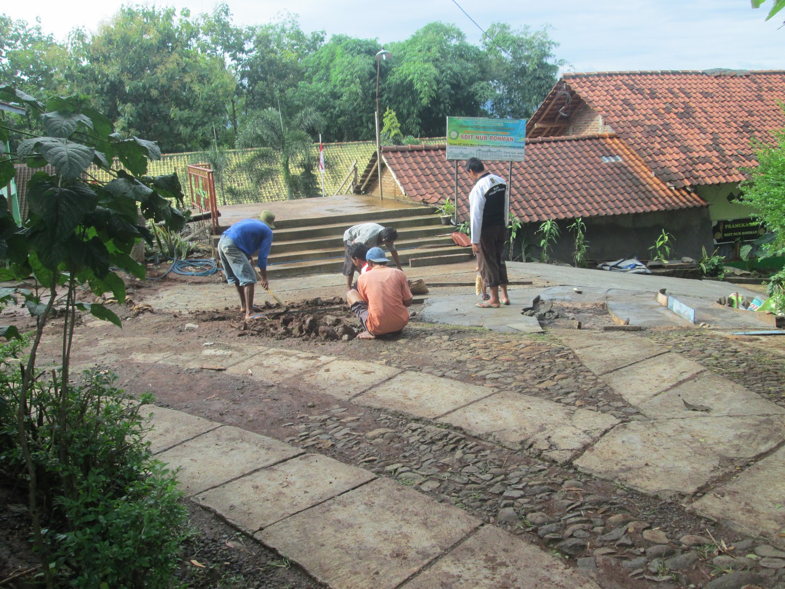 | Beberapa pekerja memperbaiki jalan masuk SDIT Nur Rohman diawasi langsung Bp Santoso (Divisi Pembangunan ) |