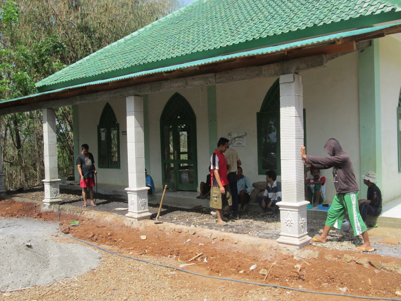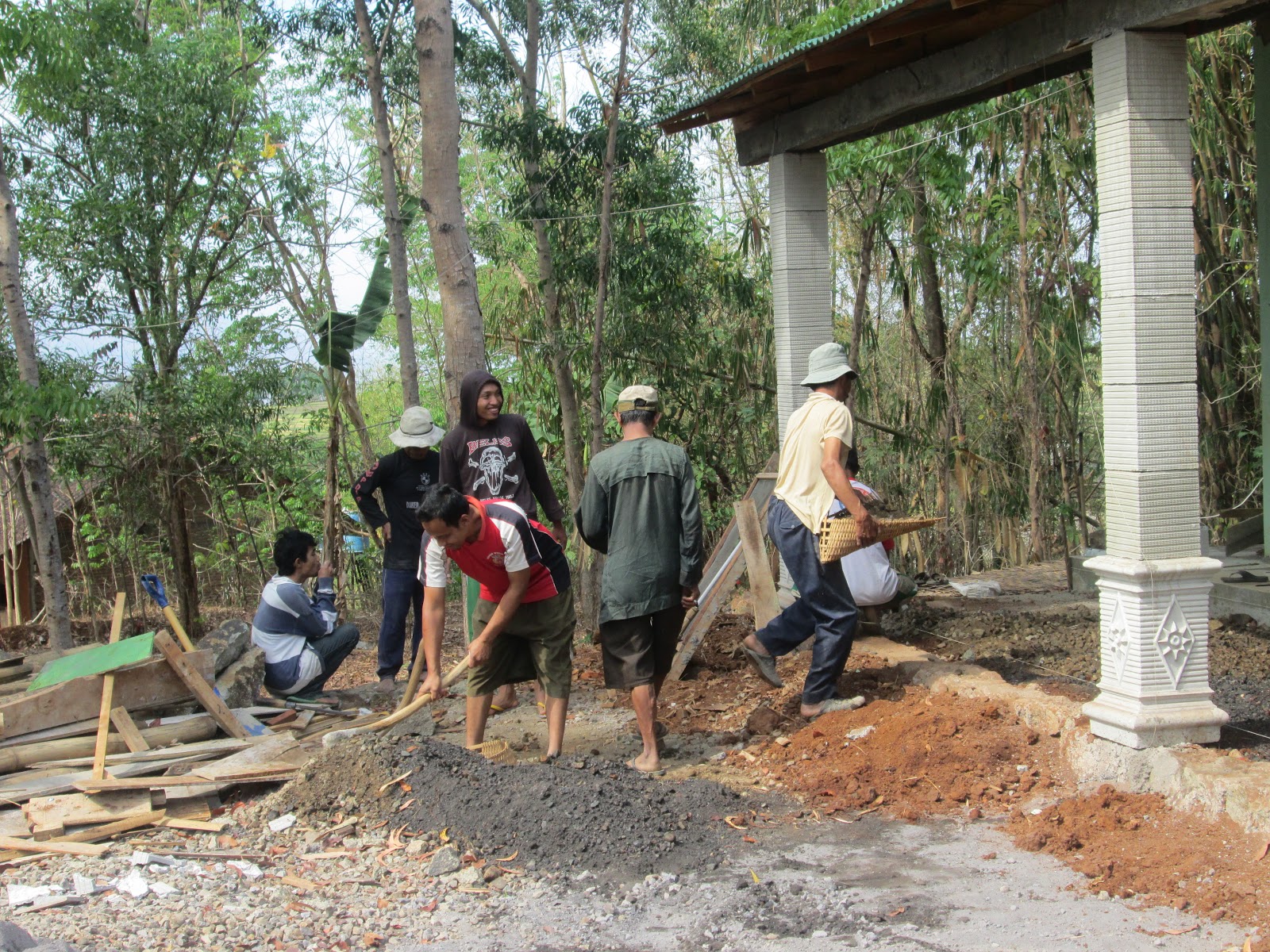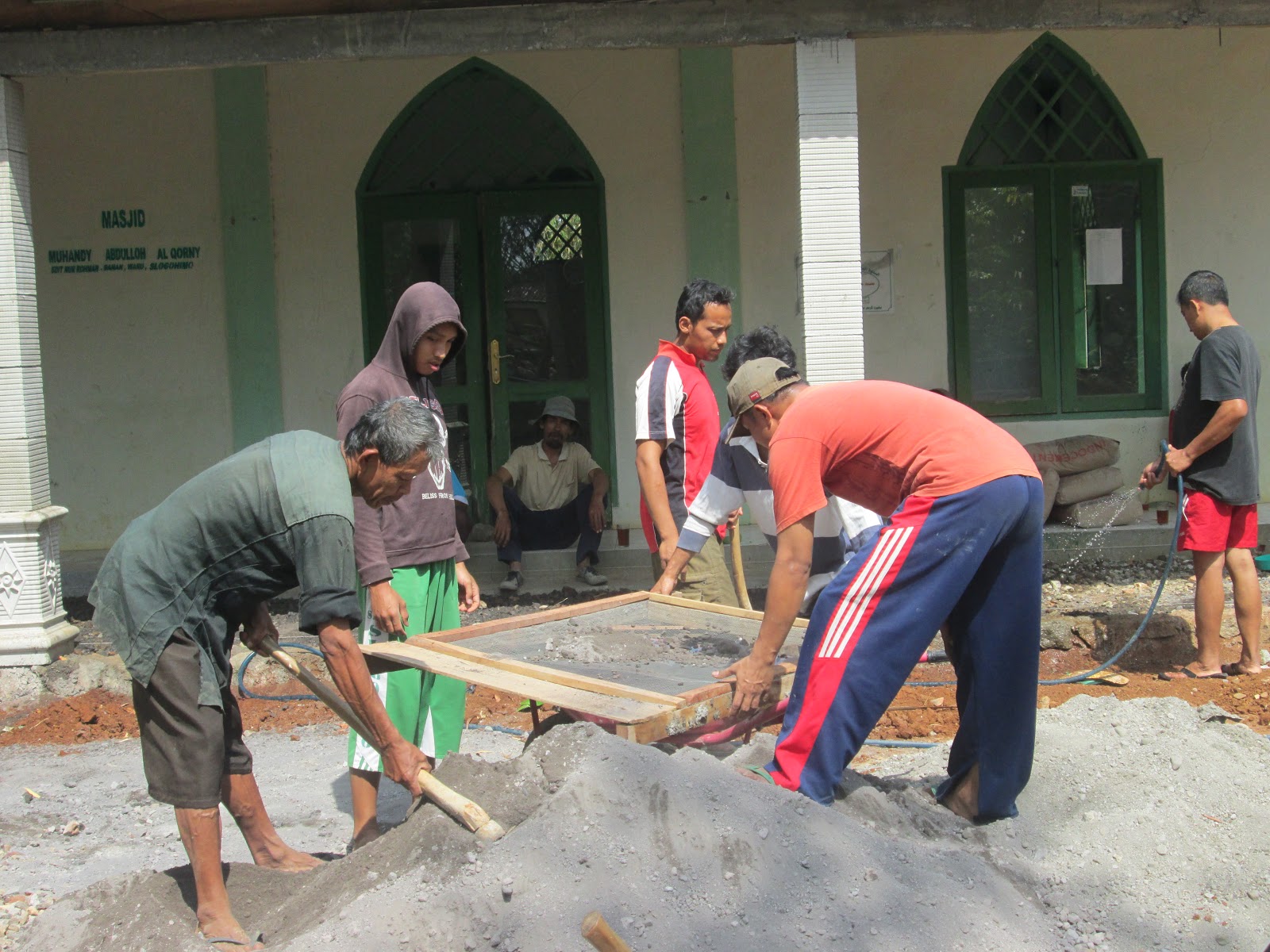 | Beberapa warga sanan tampak membantu pembuatan teras masjid SDIT |